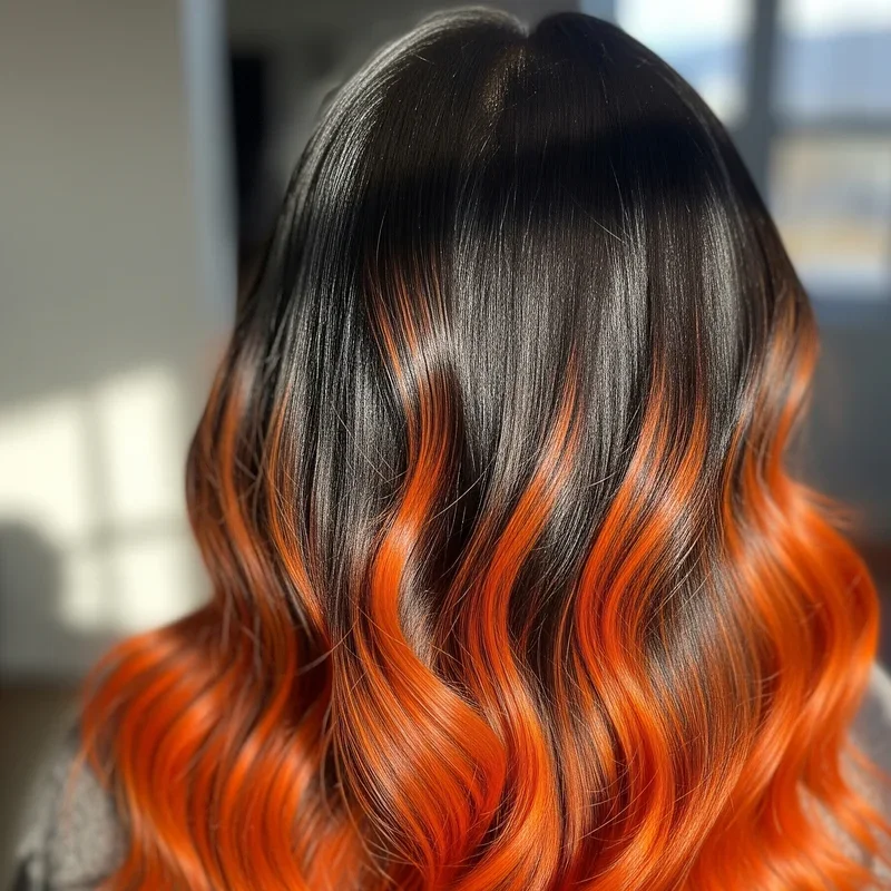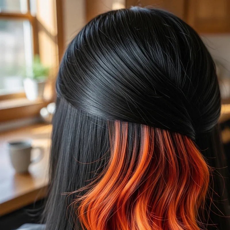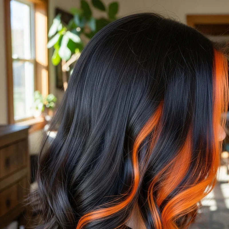 Want to keep things professional by day but party-ready by night? Orange peekaboo highlights hide beneath your black top layer, revealing flashes of fire when you move or style your hair differently. This technique involves coloring strategic sections underneath while keeping the top layer completely black. You can control how much orange shows by adjusting your part or pulling your hair back. It's perfect for anyone working in conservative environments who still wants to express their creative side. The hidden nature of these highlights also means less frequent salon visits since the orange sections aren't constantly exposed to sun and styling damage. Choose between subtle copper tones or go bold with electric orange depending on your personality.