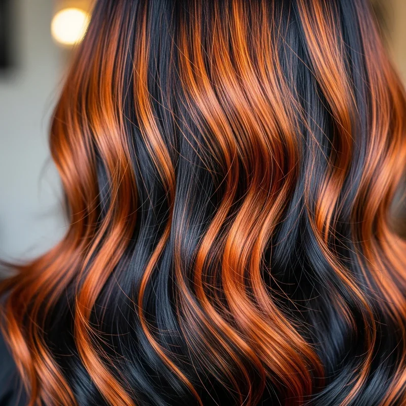 Add subtle sophistication to your black hair with a copper orange shimmer effect that catches light like autumn leaves in sunshine. This technique involves weaving ultra-fine copper orange highlights throughout black hair, creating a shimmering effect rather than obvious streaks. The colorist uses a combination of foiling and balayage techniques to achieve this multidimensional look that appears to shift between black and copper depending on the lighting. This style suits those who want something unique but not overly bold for professional settings. The copper tones add warmth to black hair without the maintenance requirements of lighter colors. Regular glossing treatments enhance the shimmer effect and keep both the black and copper tones looking rich and healthy.