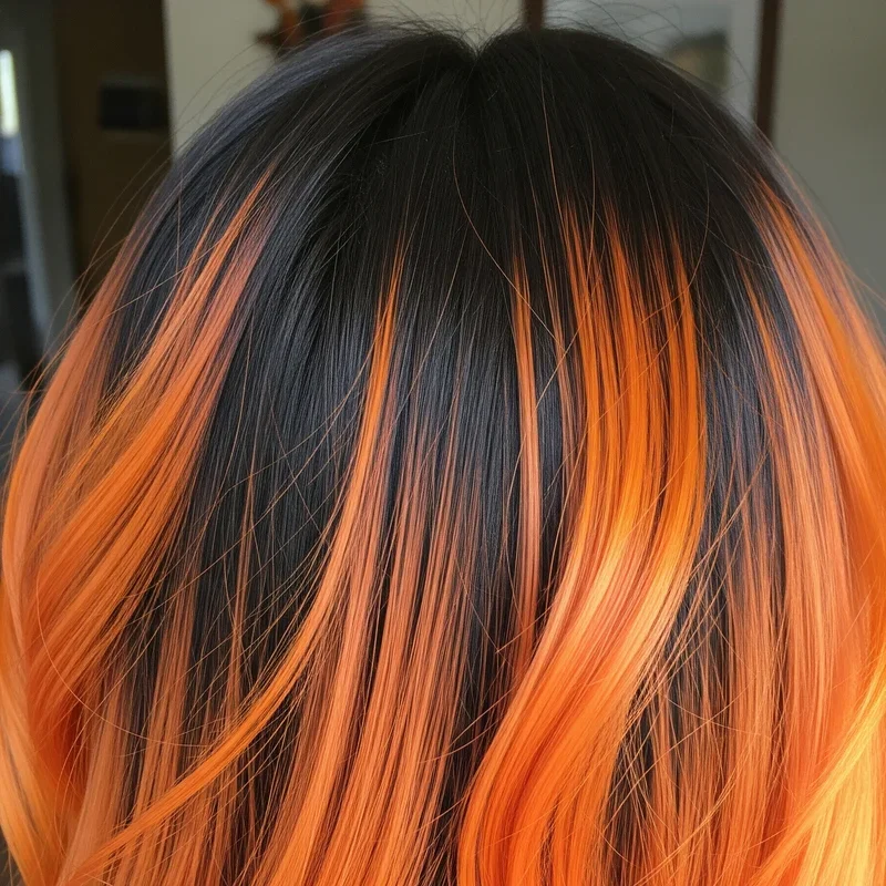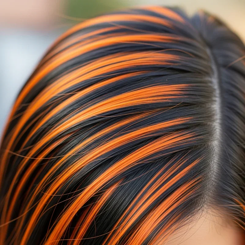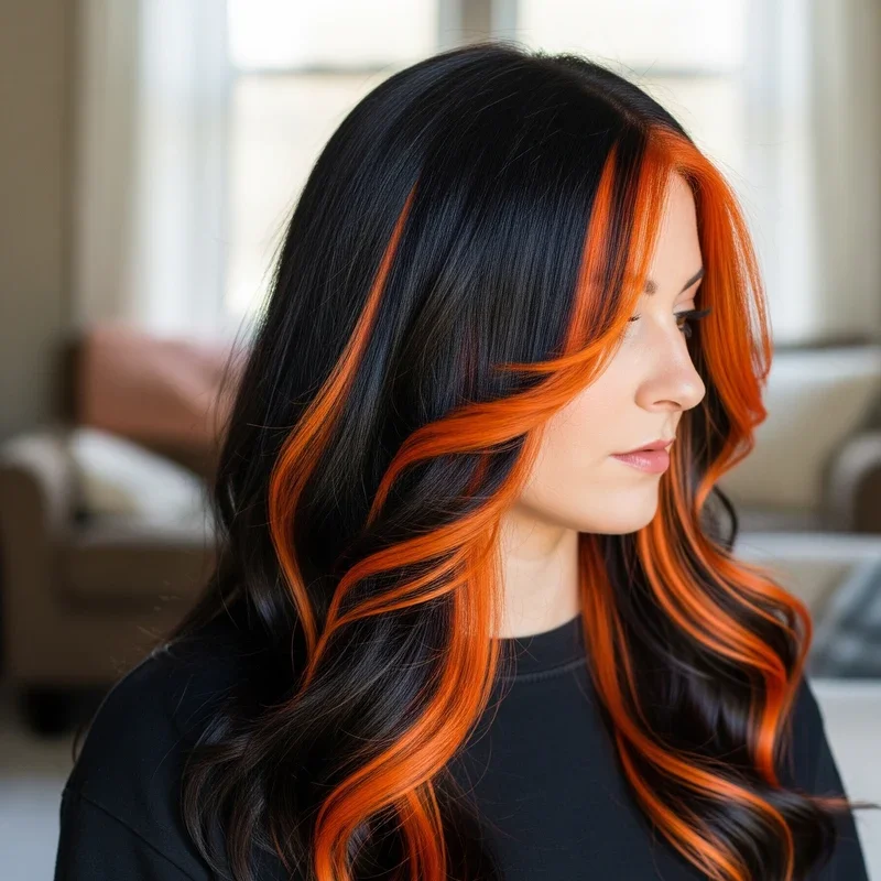 Make a bold statement with thick, chunky orange streaks strategically placed throughout your black hair for maximum visual impact. Unlike thin highlights, these substantial sections of orange create dramatic contrast and movement that's visible from across the room. The placement can be customized to your preference, whether you want symmetrical streaks framing your face or random placement for an edgier vibe. Each streak typically encompasses a section about an inch wide, creating ribbons of color that stand out against the black background. This technique works particularly well on straight hair where the clean lines of color are most visible. The chunky nature means fewer sections to maintain, though you'll want to keep the orange tones fresh with regular glossing treatments.