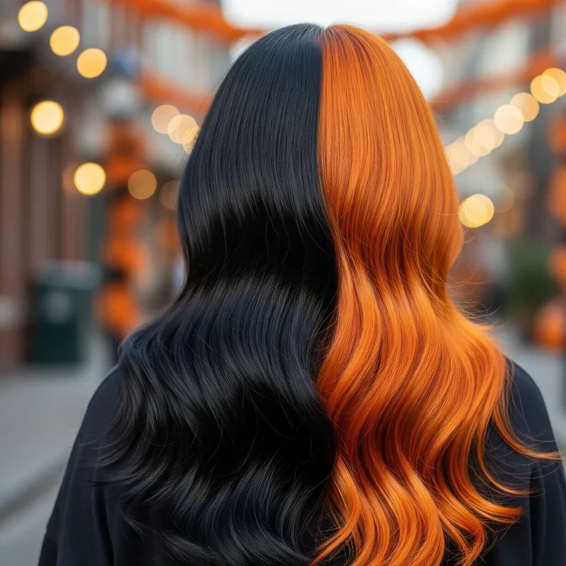 Embrace spooky season year-round with geometric color blocking that creates distinct sections of black and orange throughout your hair. This modern technique involves creating intentional blocks of color rather than blended transitions, resulting in a graphic, artistic effect. The blocks might be horizontal, vertical, or even diagonal, depending on your personal style and hair length. Some variations include checkerboard patterns or asymmetrical designs that challenge traditional hair coloring norms. This bold approach requires precise sectioning and careful application to maintain clean lines between colors. The style photographs beautifully and makes a strong statement about your creative personality and willingness to push boundaries.