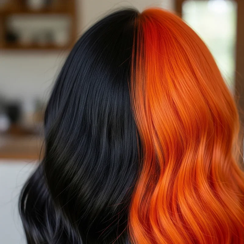The half and half split dye creates the most dramatic impact by dividing your hair perfectly down the middle with black on one side and vibrant orange on the other. This bold style makes you look like you've stepped out of a comic book or anime series. The key to nailing this look lies in achieving a clean, precise part that runs from your forehead to the nape of your neck. Professional application ensures the colors don't bleed into each other during processing. This style works best on medium to long hair lengths where the contrast really pops. You'll need regular touch-ups every four to six weeks to maintain that crisp dividing line between colors.