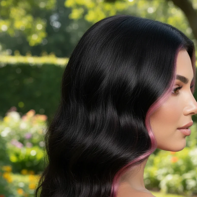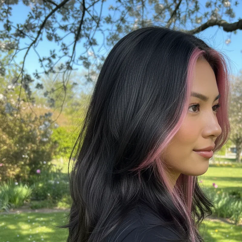 Face-framing highlights in pink against a black base create the perfect way to brighten your complexion while adding a pop of personality to your overall look. These strategic streaks, often called money pieces, draw attention to your best features while creating a flattering frame that works with virtually any face shape. The contrast between the soft pink and deep black creates dimension that photographs beautifully, making this style a favorite among content creators and anyone who loves a good selfie. You can adjust the width and intensity of these highlights to suit your comfort level, from thin, subtle streaks to bold chunks that make a statement. This technique works especially well with layered haircuts, as the pink pieces can be woven through different lengths to create movement and depth. Best of all, this style requires minimal commitment since you're only coloring small sections, making it perfect for color virgins.