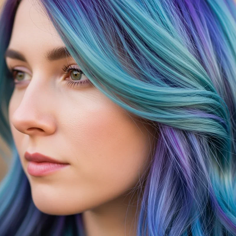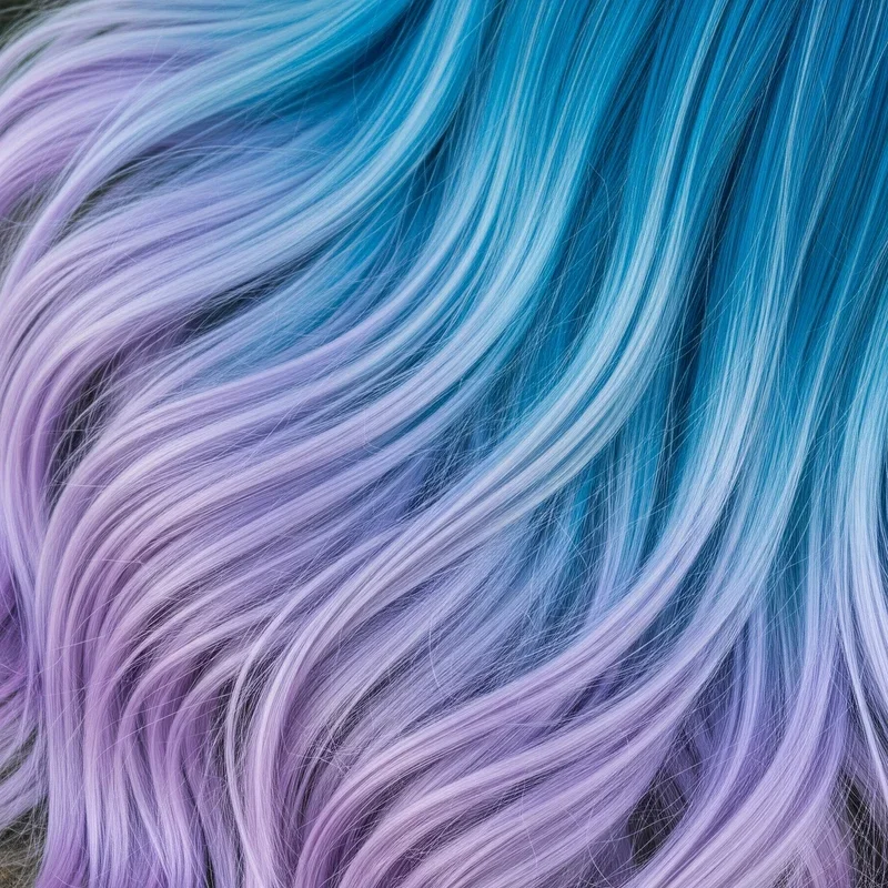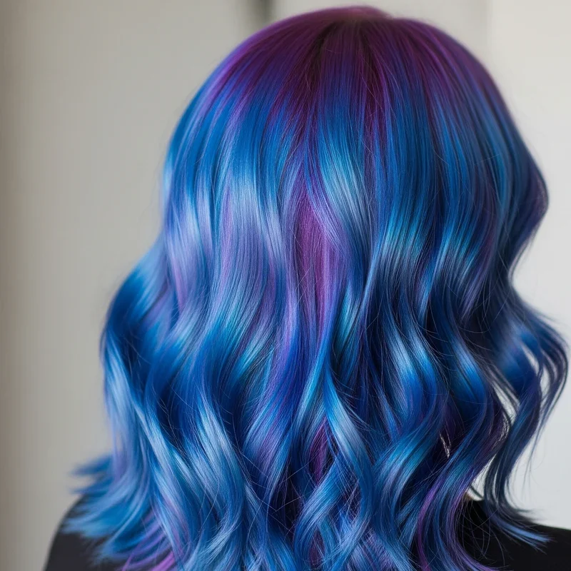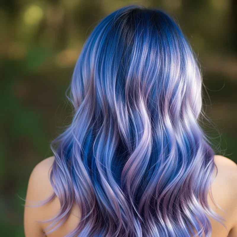 Enter the future with holographic hair that shifts between blue and purple with an opalescent shimmer that seems to glow from within. This cutting-edge color technique uses special formulations that create a prismatic effect, making your hair appear different colors depending on the angle and lighting. The base typically starts with a pale, almost silver canvas before applying translucent blue and purple tones that interact to create the holographic effect. This style requires expert application and specific products to achieve the true holographic finish rather than just mixed colors. The result is hair that looks like it belongs in a sci-fi movie, constantly shifting and shimmering with every movement. While this requires significant upkeep and special color-safe products, the otherworldly effect makes you look like you've stepped out of another dimension.