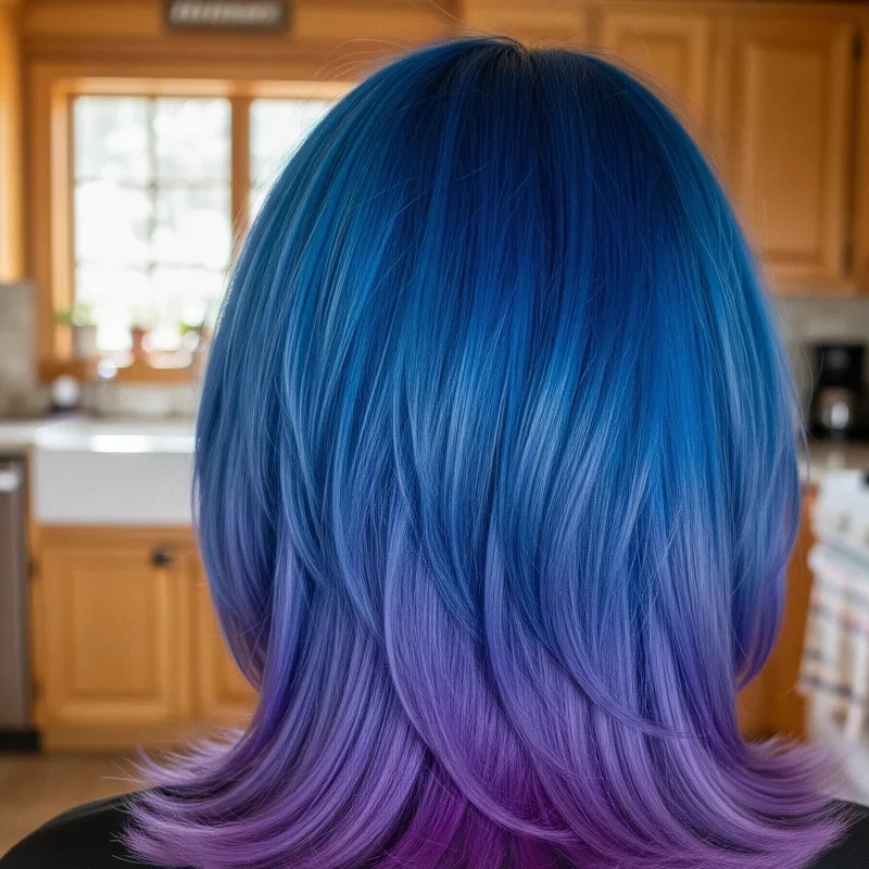 For those who prefer their colors rich and saturated, the deep indigo to violet gradient delivers drama without being overwhelming. This sophisticated gradient starts with mysterious indigo at the roots, slowly transitioning through various purple stages until reaching bright violet at the tips. The gradual color shift creates an elongating effect that makes hair appear longer and more luxurious while maintaining a cohesive color story from root to tip. This style works beautifully on all hair lengths but particularly shines on long hair where the full gradient can be appreciated. The deeper tones mean less frequent touch-ups compared to pastels, and the gradient grows out naturally without obvious roots showing. Style it straight to showcase the smooth color transition or add curls to create a rippling effect that brings the gradient to life.