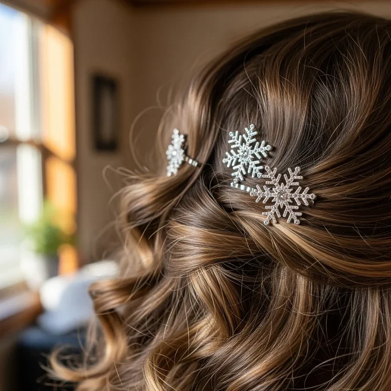 Channel your inner ice princess with cascading side-swept curls adorned with delicate snowflake barrettes that sparkle like fresh winter frost. Start by creating loose, bouncy curls throughout your hair using a medium-barrel curling iron, then sweep everything dramatically to one side and secure behind your ear with bobby pins. The snowflake barrettes should be placed strategically along the swept side, creating a constellation of winter wonder that frames your face beautifully. This romantic style works especially well for those with longer hair who want to show off their length while keeping hair out of their face during dinner conversations. The asymmetrical nature of this look adds visual interest and photographs beautifully, making it perfect for all those holiday selfies and family portraits. You'll feel like you've stepped out of a fairytale every time you catch your reflection.