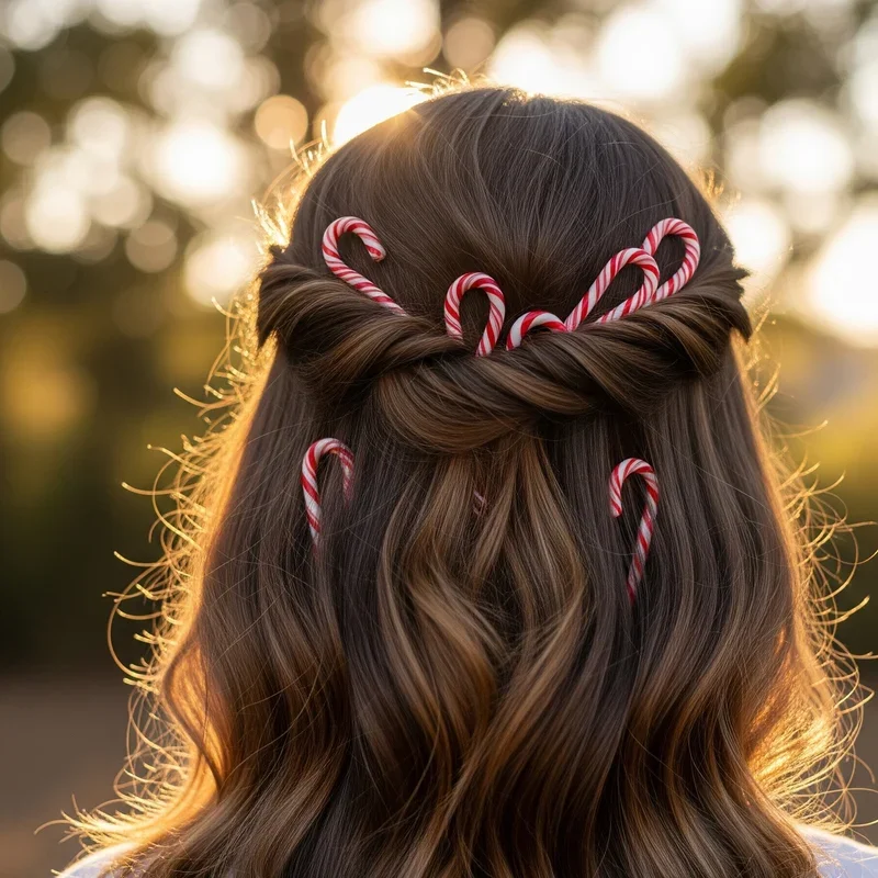 Finish our festive hair journey with effortlessly beautiful loose waves decorated with candy cane hair accessories that bring sweet holiday charm to any look. Create relaxed waves using a large barrel curling iron or overnight braids, then gently run your fingers through them for that perfectly imperfect beachy texture that looks naturally gorgeous. Clip miniature candy cane hair accessories throughout your waves, spacing them randomly for an organic feel rather than a structured pattern that might look too calculated. This versatile style works for literally any Christmas occasion because you can adjust the number of accessories based on how festive you want to appear. The beauty lies in its simplicity since the waves provide a gorgeous base that would look stunning even without the candy canes, but the accessories add that special holiday touch. You'll find yourself reaching for this easy yet impactful style repeatedly throughout the season because it delivers maximum effect with minimum effort.