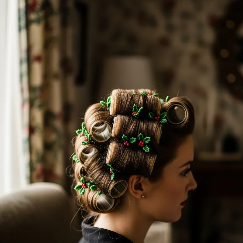 Step back in time with these gorgeous vintage pin curls that bring 1940s glamour to your modern Christmas celebration with the addition of festive holly berry clips. Section your damp hair into small portions, wrap each around your finger to create a flat curl against your scalp, and secure with bobby pins before setting with hairspray. Once dry and released, these curls create a stunning retro wave pattern that frames your face beautifully while the holly berry clips add that perfect Christmas touch. This intricate style shows dedication to your holiday look and works wonderfully for themed parties or when you want to make a memorable impression at formal events. The combination of vintage technique and seasonal accessories creates a unique look that stands out in a sea of standard holiday hairstyles. You'll feel like you're starring in your own classic Christmas movie with every perfectly placed curl.