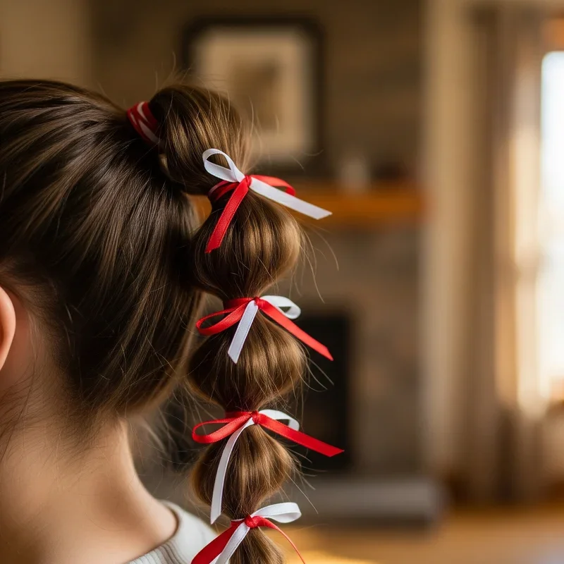 14. Bubble Ponytail with Red and White Ribbons