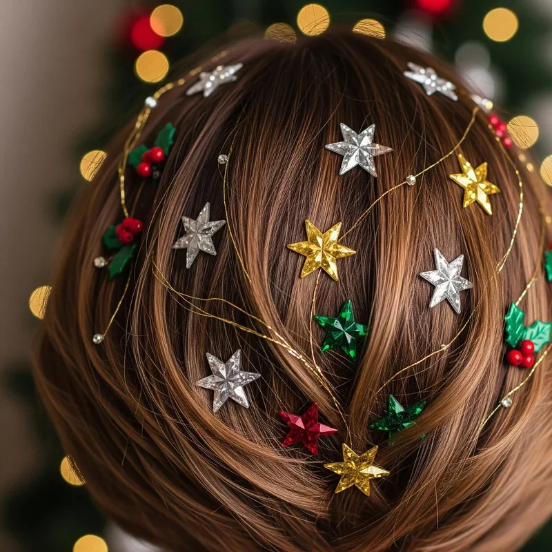 Short hair gets its time to shine this Christmas with a textured bob adorned with adhesive star hair gems that prove you don't need length for holiday glamour. Style your bob with texturizing spray and a curling wand to create piece-y, tousled waves that give your hair movement and body perfect for showcasing those twinkling stars. Apply small adhesive hair gems in a constellation pattern throughout your hair, concentrating them more heavily on one side for an asymmetrical effect that's both modern and festive. This edgy yet elegant style proves that bob-length hair can be just as festive as longer styles and works especially well for those who want something unique but not overwhelming. The combination of textured styling and strategic gem placement creates depth and interest that makes your short hair the star of the show. You'll love how this style transitions easily from day to night events with just a few extra gems added.