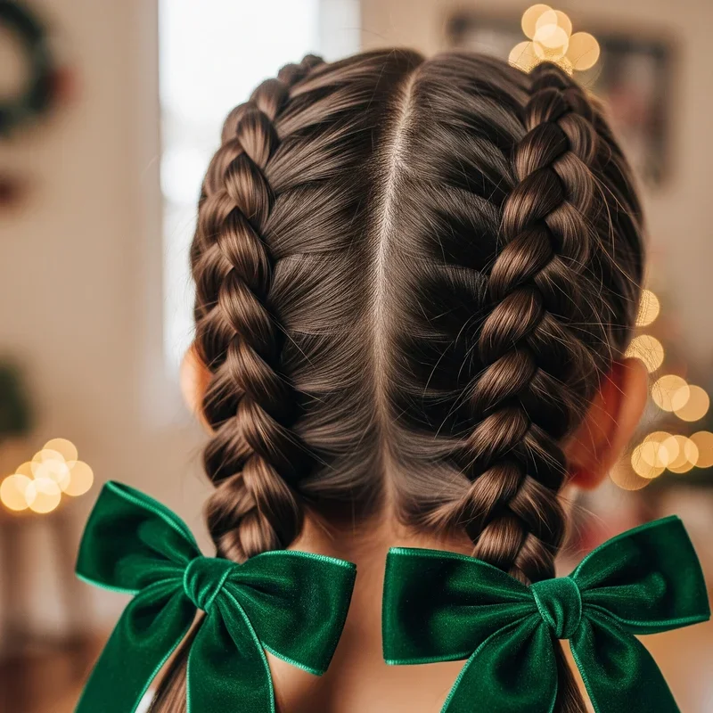 7. Dutch Braid Pigtails with Green Velvet Bows