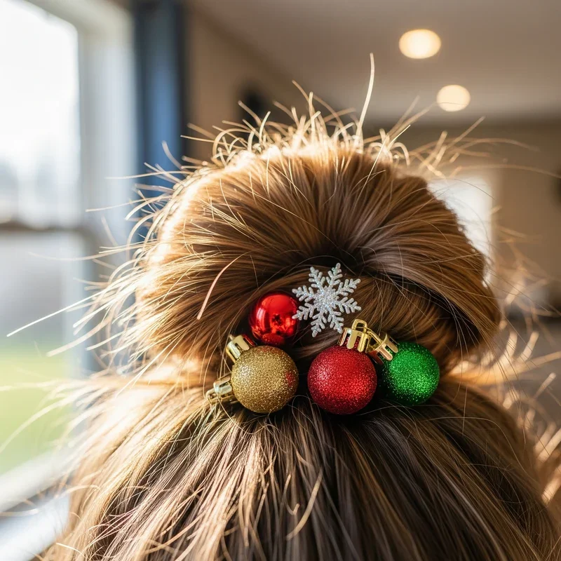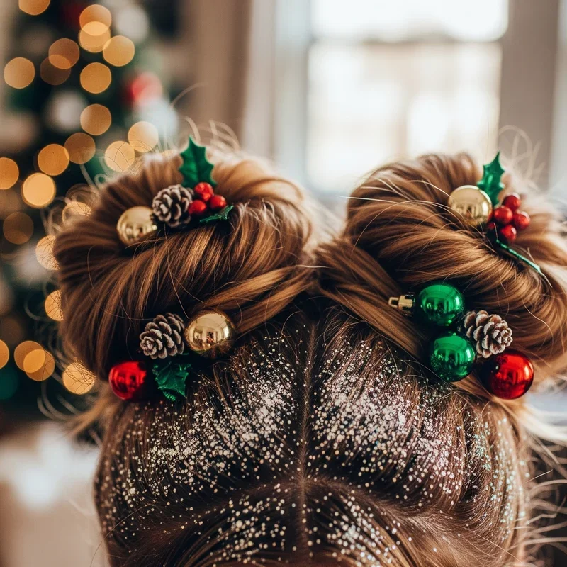 Sometimes the best holiday hairstyles are the ones that look effortlessly chic while secretly being super simple to create. This festive messy bun takes your everyday updo and transforms it into something special with the addition of miniature Christmas ornaments as hair accessories. Pull your hair into a high ponytail, twist it loosely, and wrap it around the base, leaving some pieces strategically messy for that perfectly imperfect aesthetic. Secure small, lightweight ornaments using bobby pins around the bun, choosing colors that complement your outfit like gold, silver, or classic red and green. The beauty of this style lies in its adaptability since you can dress it up or down depending on your celebration. It's ideal for those busy holiday mornings when you need to look put-together but don't have time for elaborate styling sessions.
