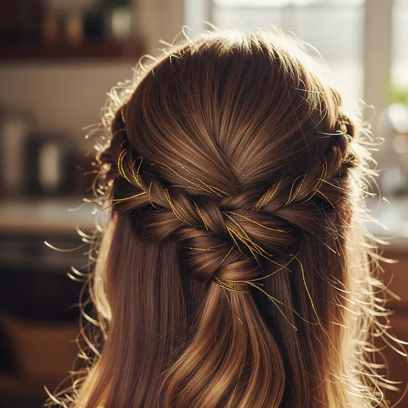 4. Half-Up Twisted Style with Golden Tinsel