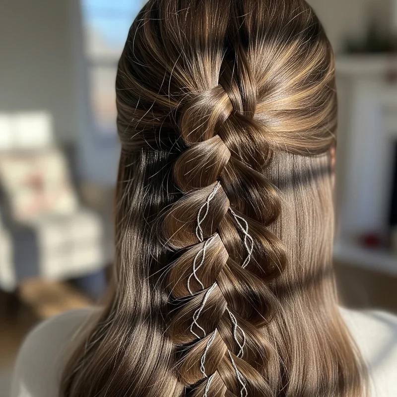 Create an absolutely dreamy holiday look with this romantic waterfall braid that cascades like a frozen waterfall adorned with silver accessories. Start the braid from one side of your head, allowing strands to fall through as you work your way across, creating that signature waterfall effect that looks incredibly complex but becomes simple with practice. Weave in small silver stars, pearls, or metallic thread throughout the braid to add that winter wonderland touch without overwhelming the delicate nature of the style. This ethereal hairstyle works beautifully with both straight and wavy hair textures and creates a soft, feminine look perfect for romantic Christmas dinners or winter weddings. The flowing nature of the waterfall braid combined with subtle silver accents creates movement and dimension that photographs like a dream. Every turn of your head reveals new angles and catches light differently, making this style endlessly captivating.
