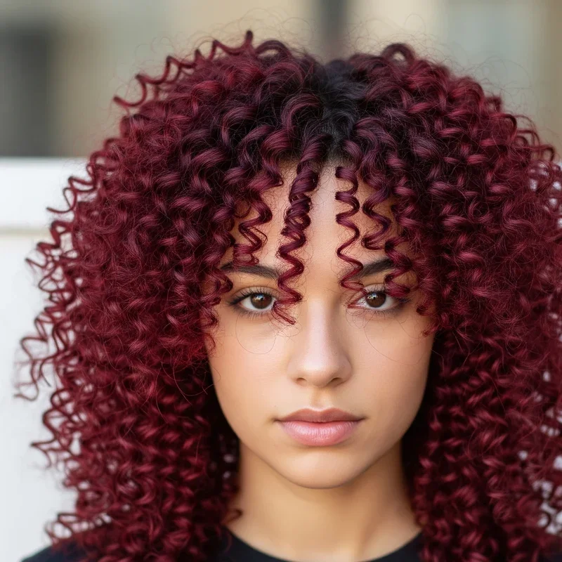 Cherry cola red brings the perfect balance of sophistication and edge to curly hair, combining deep cherry tones with cola-brown undertones. This multidimensional shade creates richness that makes your curls look healthy, shiny, and absolutely delicious. The color shifts between deep red and brown depending on lighting, giving you multiple looks in one shade. This option works beautifully on various base colors, from medium brown to black, without requiring excessive lightening. Your curls will catch light like garnets, sparkling with depth and intensity that demands attention. The cherry cola shade complements most skin tones, adding warmth without overwhelming your natural coloring. This color tends to fade gracefully through various red-brown stages, meaning your hair looks intentional even weeks after coloring. Regular gloss treatments keep this shade looking fresh and vibrant between salon visits.