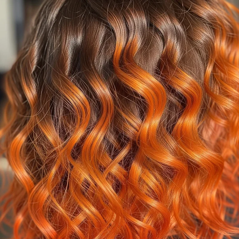 Sunset orange ombre on curly hair creates a gradient masterpiece that looks like the sky during golden hour. Starting with deeper roots that transition into bright orange ends, this technique makes your curls look like they're literally on fire. The gradual color shift works perfectly with curl patterns, as each ringlet showcases different shades within the ombre spectrum. This bold choice suits those who want to make a statement without committing to all-over color. The orange tones bring warmth to any complexion, particularly stunning on those with warm undertones. Your curls become these cascading flames that move and shift with every bounce. The best part? As it grows out, the ombre effect remains intentional-looking, giving you more time between touch-ups while maintaining that fresh-from-the-salon vibe.