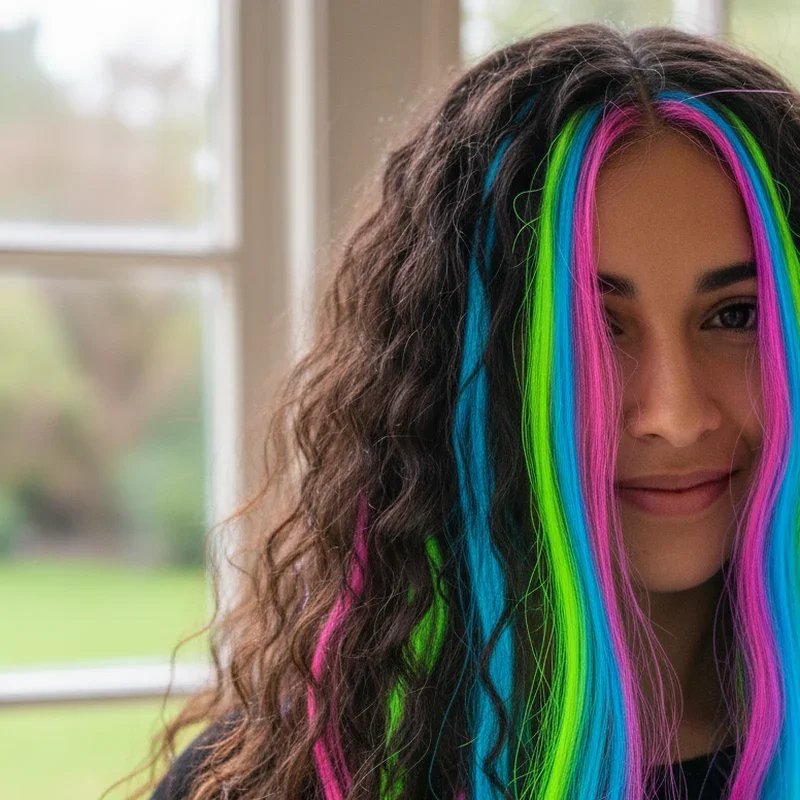 Amp natural hair with strategic neon highlights adding electric color pops without complete coverage. This approach lets you keep base colors while adding vibrant neon pink, electric blue, lime green, or shocking orange streaks. Contrast between natural shades and ultra-bright accents creates dynamic, edgy yet wearable looks. Placement is key—face-framing pieces make bold statements, while scattered throughout creates playful effects. These intense colors require pre-lightening for maximum vibrancy and regular touch-ups maintaining electric intensity. Perfect for experimenting with bold colors without fully committing to all-over transformations, neon highlights offer fashion color gateways easily adjusted or removed. This creates perfect balance between natural beauty and bold statements suiting those wanting experiments without full commitment.