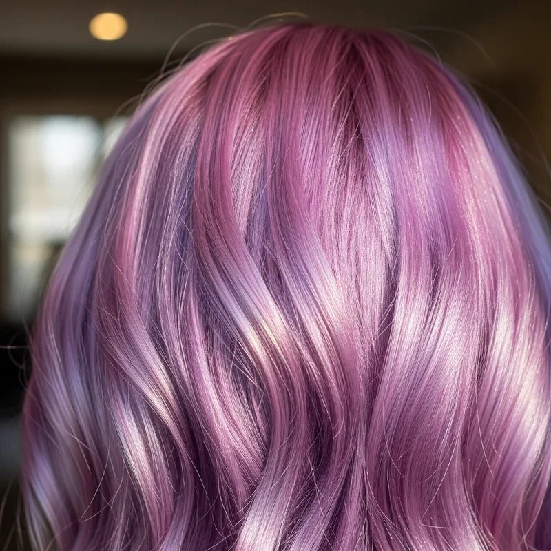 Take your color game to the next level with metallic finishes that add an almost holographic quality to traditional pink and purple shades. These specialized formulas contain light-reflecting particles that create a shimmer effect similar to crushed pearls or diamonds scattered through your hair. The metallic finish makes colors appear multi-dimensional, shifting between pink and purple depending on light angles and movement. This futuristic look requires special formulation and application techniques that not all colorists offer, so research is essential before booking. The metallic effect is most visible on very light or white blonde bases where the shimmer particles can really pop. While absolutely stunning, these colors require specific care products designed for metallic hair colors to maintain their unique finish and prevent dulling.