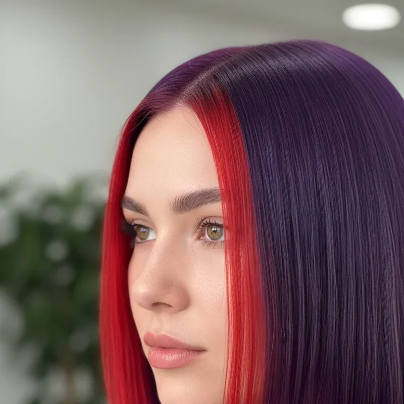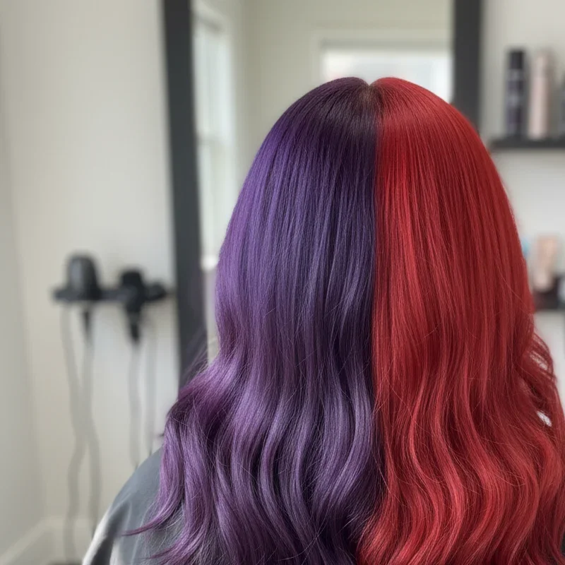 Split-dye hair divides your head into two distinct color zones, creating an incredibly bold and artistic statement that turns heads wherever you go. This dramatic style typically features vibrant red on one side and rich purple on the other, meeting in a clean line down the middle of your head. You'll love how this look changes depending on which angle people see you from, almost like having two completely different hairstyles in one. The key to nailing this style lies in choosing the right shades that complement each other while still providing enough contrast to make the split obvious. Some adventurous souls even add different textures or curling patterns to each side, enhancing the duality of this eye-catching style that perfectly represents having multiple facets to your personality.